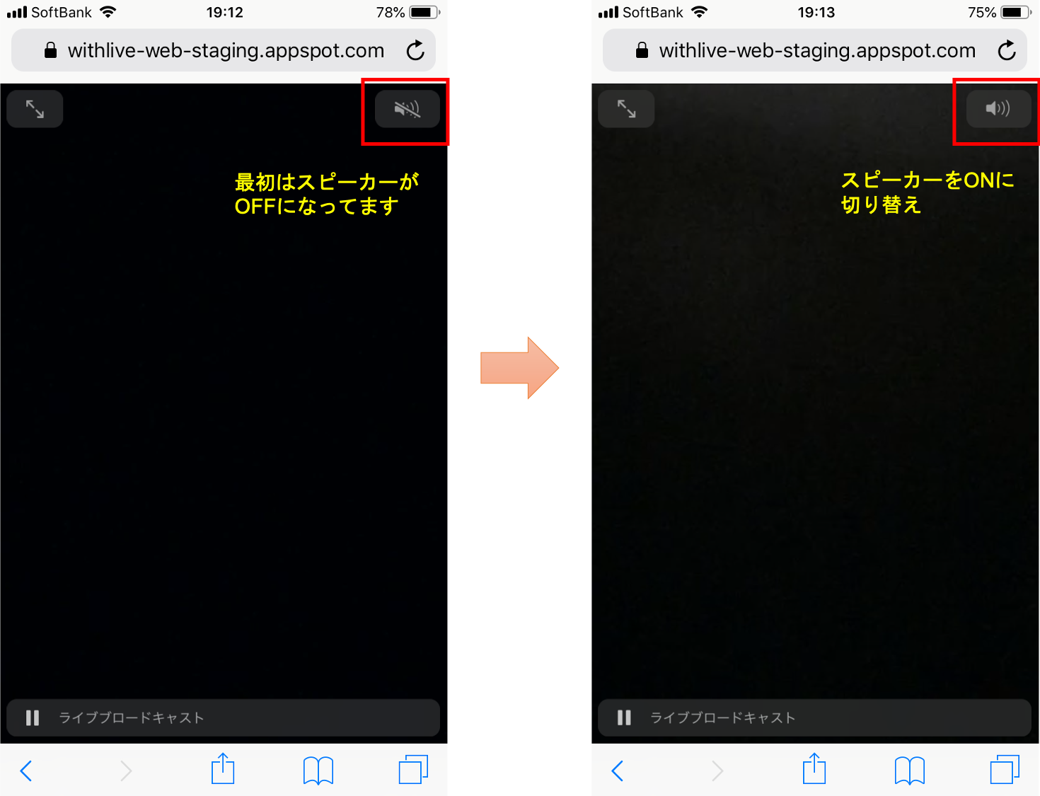 「ライブ配信開始後」に右上のスピーカーボタンを押して音がでるようにしてください。